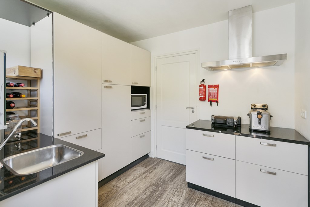 Begane grond: Royale oprit met parkeerruimte voor meerdere auto’s, aansluitend carport voorzien van lichtkoepel. Ruime voortuin met diverse beplanting. Entree; ruime hal voorzien van een mooie (geboende) eikenhouten vloer ‘rustiek’ welke doorloopt in living en keuken, de wanden zijn uitgevoerd met stucwerk. In de hal treft u verder de fraaie trapopgang naar de eerste verdieping en de geheel betegelde toiletruimte uitgevoerd met een wandcloset en fonteintje. Vanuit de hal heeft u toegang tot de zeer royale living, met volop lichtinval door de grote raampartijen en schuifpuien aan voor- en achterzijde, wanden deels met stucwerk en deels met design behang, stuc plafond, voornoemde eikenhouten vloer en een sfeervolle, dubbelwandige houtkachel. Aansluitend de open woonkeuken met grote raampartijen, inbouwspots, voornoemde eiken vloer en luxe keukeninrichting. Het hoek opgestelde keukenblok is uitgevoerd met volop kastruimte, praktische lades, (wit) natuurstenen werkblad, RVS spoelbak en (Samsung) koelvriescombinatie. Diverse inbouwapparatuur te weten; een oven van Imperial, vaatwasser (Miele), grote inductieplaat (AEG) en extra brede design afzuigkap maken het geheel compleet. Deur naar de praktische bijkeuken uitgevoerd met een houtlook PVC vloer en keukeninrichting bestaande uit een wandmeubel, spoelgedeelte en keukenblok uitgevoerd met een zwart marmeren werkblad en afzuigkap. Vanuit de bijkeuken deur naar de praktijkruimte. Deze praktijkruimte met grote raampartij en eigen ingang is voorzien van een houtlook PVC vloer, kastenwand, wastafel en warmtepaneel aan plafond.